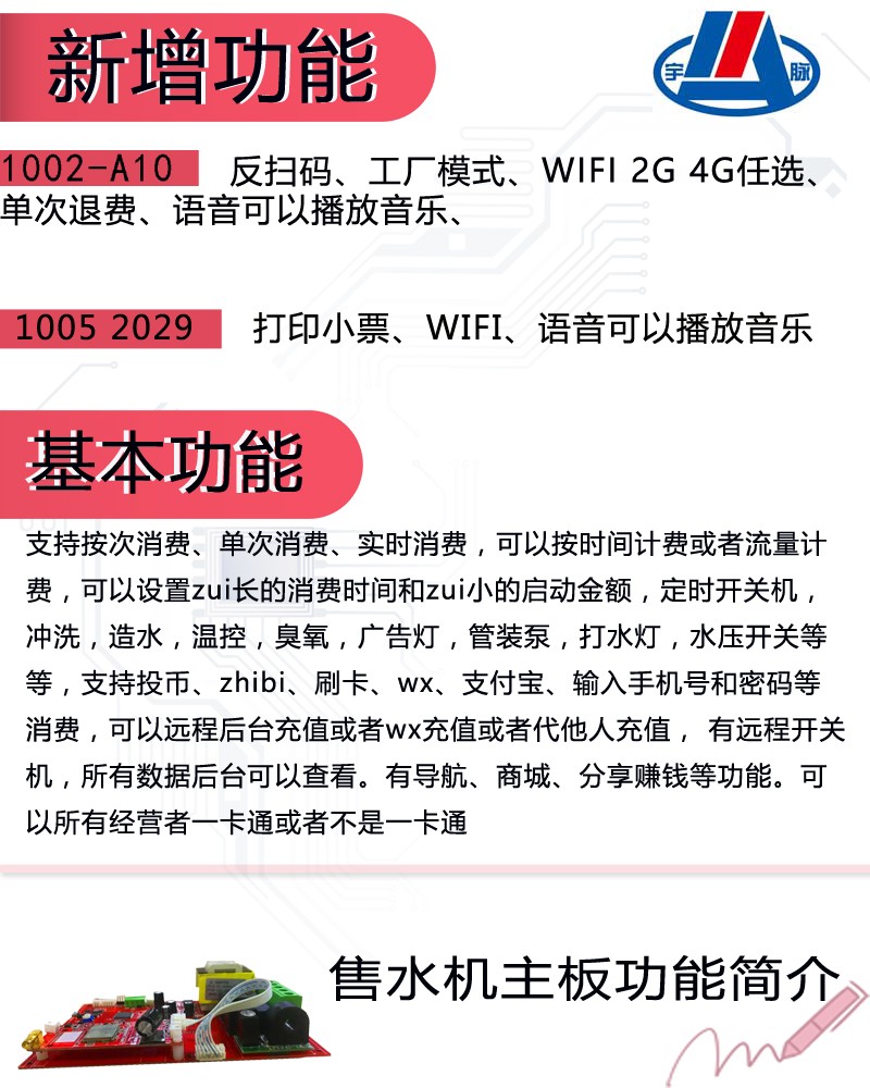 宇脉电子成立于2003年,公司主要以研发、设计、生产、销售单片机为主,最早是以单机板为主,随着人们的消费水平提高,信息时代的不断更新,现公司已推出联网售水机主板,最早的单机板主板只能实现投币、纸币、刷卡这些支付方式,然后现在推出的高端联网款不仅可以实现单机板的支付功能,还多增加了微信扫一扫、公交卡、银行卡、输入手机号与密码都可以支付,而且注册会员后都可以自己用手机或电脑查到自己的消费记录,所以这款售水机主板可以让你不带钱都能享受同等的待遇,是不是特别适合现在的消费群体。