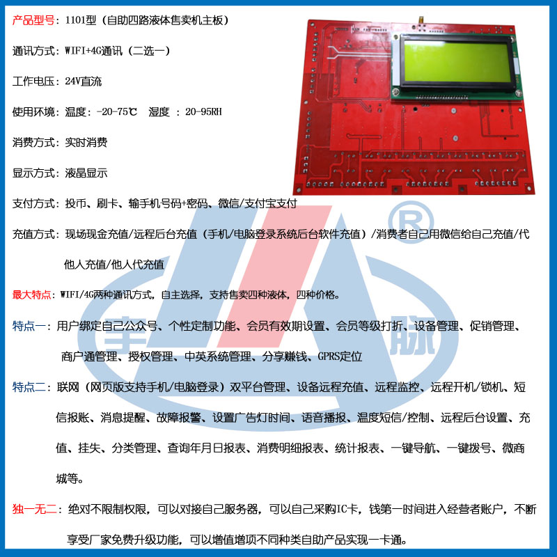微信刷卡投币自助四路液体售卖机主控板,宇脉MCU单片机厂家,自主研发生产销售,联网多功能支持定制开发,真正拥有自己的研发团队。 提供免费升级功能,让您的设备不落后于时代。我们坚守着“只有客户好,公司才能发展得更好”的理念,只要您相信我们,我们愿与您共同成就更好的未来,共同成长,共同发展,携手打造一体化智能智慧社区。社区一卡通,让您拥有大数据管理!欢迎来电咨询:18520500709/400-1898-020